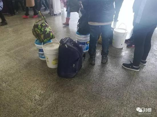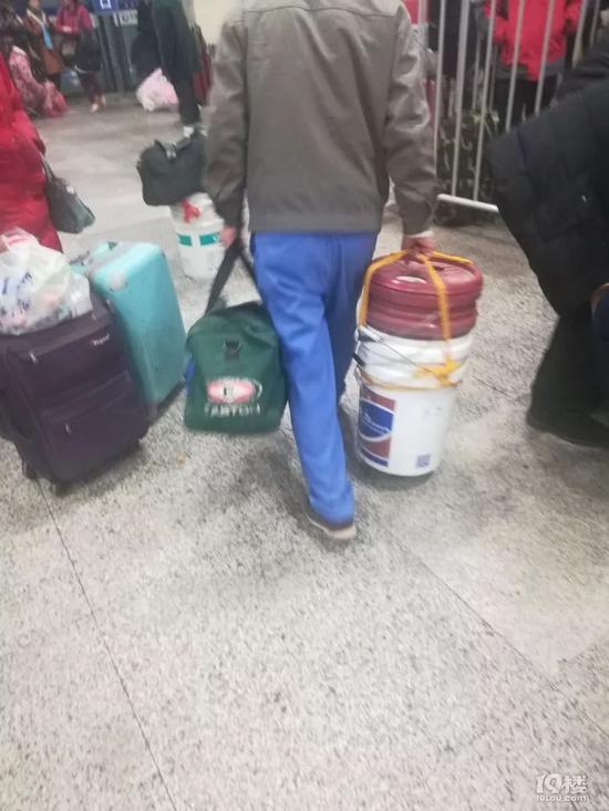一位安徽宿州乘客说,他去年带了100多个这样的涂料桶回家,都是工地捡来的,怎么拎上火车?每个兄弟帮忙拿几个,叠起来拎,拿到家一个养猪的亲戚就要去了50个,朋友街坊邻居分分,最后自己还剩四五个。