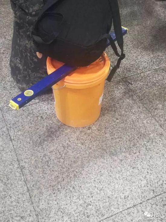 旁边那位师傅,一看也是工地上的,他绑在行李箱上的水平尺,应该是铺装瓷砖大理石的工具。他也带了三个涂料桶,其中一个桶上绑着一口高压锅。