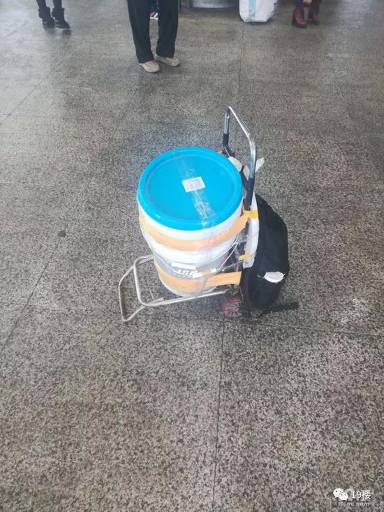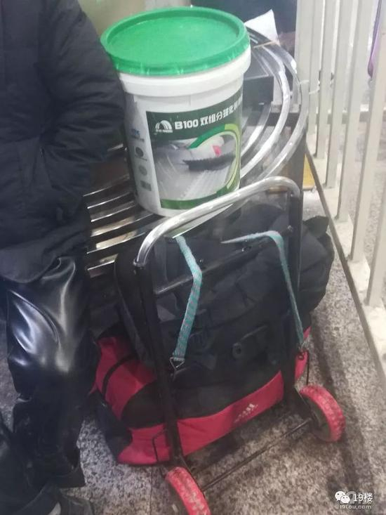 陈大姐旁边站着的,是河南老乡柴师傅,他行李箱上绑了一个红塑料桶,柴师傅说是他花13块钱买的,干净漂亮,但和涂料桶比,显得又脆又薄,根本不敢坐上去。