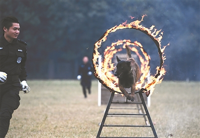 | 警犬进行跨越障碍技能演示,图为正在穿越燃烧的火圈。 |