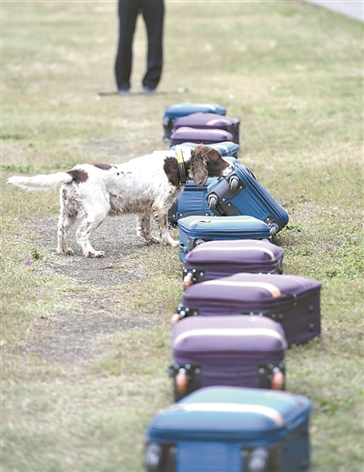| 以搜爆搜毒的警犬多为中小型犬,如史宾格犬等。图为搜毒犬演示搜毒技能,对可疑箱包逐一嗅闻。 |