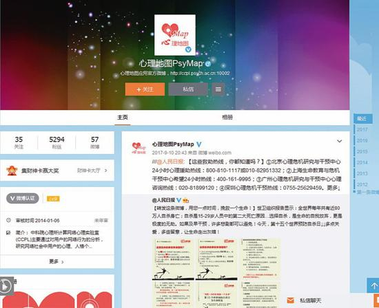 罗芙收到的这条私信来自中科院行为科学重点实验室的互联网心理危机(自杀)监测预警中心,当时,这还是他们关于自杀干预的一个研究课题。团队所做的事情简单来讲,就是在“走饭”微博几十万条评论中用人工智能的方式检索出有自杀意念的微博,用“心理地图PsyMap”的账户自动给对方发送私信,精确投放帮助信息。2017年4月,他们为了让课题组所做的事情更规范化,于是申请成立了互联网心理危机监测预警中心。