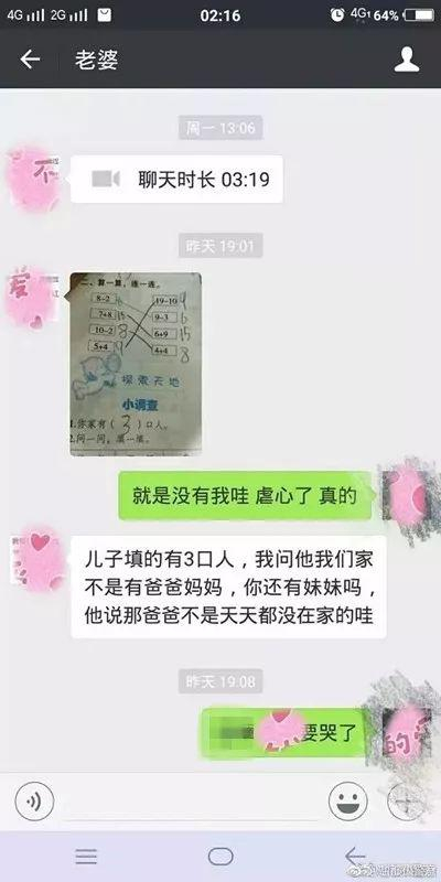 2月2日,微博网友发的一张图片也让很多人觉得扎心,图片中,一个警察的儿子做数学填空题没有把父亲计算在内,理由是“爸爸不是天天都没在家的哇”。