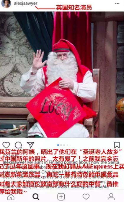 英国知名演员Alexjsawyer在自己的社交媒体上说,“我的芬兰阿姨送我了一张圣诞老人过中国新年的照片,感觉很有意思,看来要去速卖通上买些新年装饰了!”