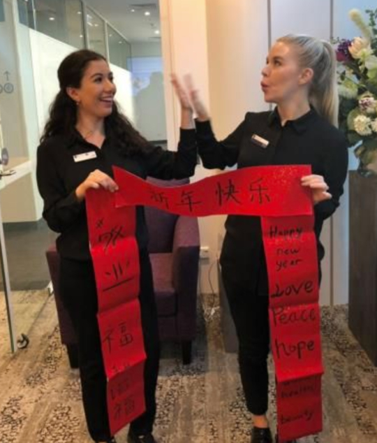 为了迎接在春节期间大批入境的中国游客,澳洲一家医美医院的两位美女“护士”就买来了红宣纸和毛笔,对着中国字一笔一划地写起了春联。
