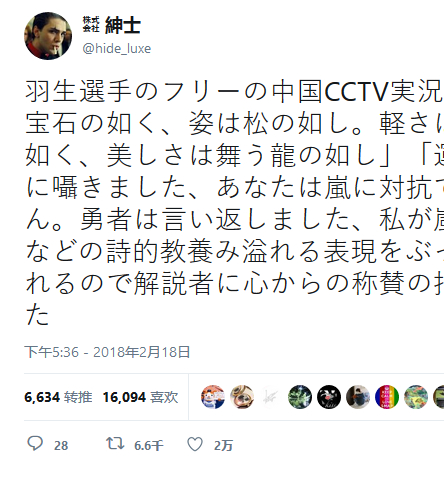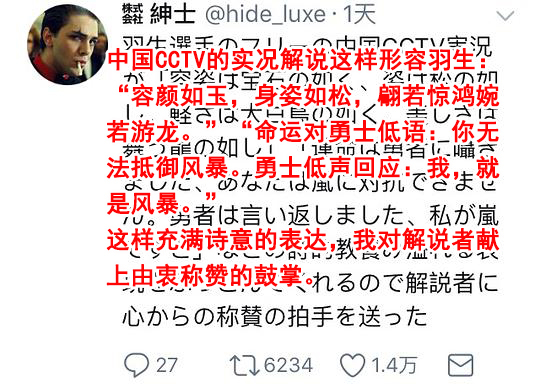 羽生结弦夺冠的次日(18日),就有日本网民将陈滢的这段解说翻译成了日语: