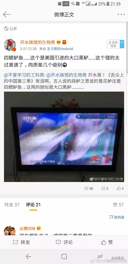第3集引发了常识性的吐槽,带火了鲈鱼话题。节目里错将大口黑鲈(美国加州鲈)当成花鲈: