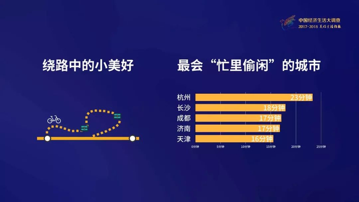 哪里的人最喜欢骑车绕道,忙里偷闲呢?根据大调查数据,最喜欢在单车上享受美好生活的城市是:杭州、长沙、成都、济南、天津。