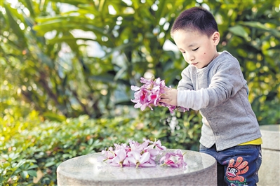 | 东湖公园紫荆成林,小男孩捡起落花,喃喃地说要送给妈妈。 广州日报全媒体记者陈忧子摄 |
