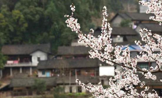 2018年3月6日,贵州铜仁,世昌街道石花社区的一棵杏花树开得正艳,对面其中有栋房子是石晓琴的家。