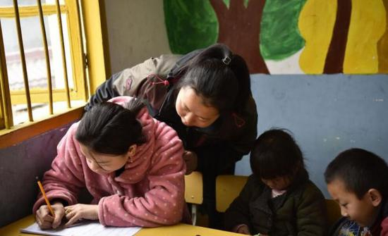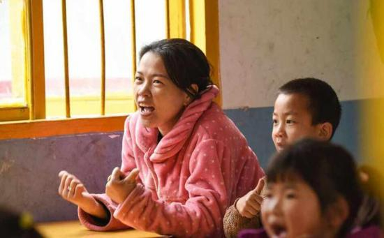 今年,夫妻俩回家过完春节,丈夫再一次外出务工,大女儿报名入园,石晓琴留在家里照顾孩子和老人。 “带小孩也是玩,陪女儿一起去读书,不但可以学到知识,还可以更好地辅导女儿。” 石晓琴走进学校的大门。 学校老师被她勇气所感动,接受了这位“大”学生,并安排她在学前班跟班学习,从汉语拼音开始学起。 班主任池明霞在课堂上指导石晓琴写字。