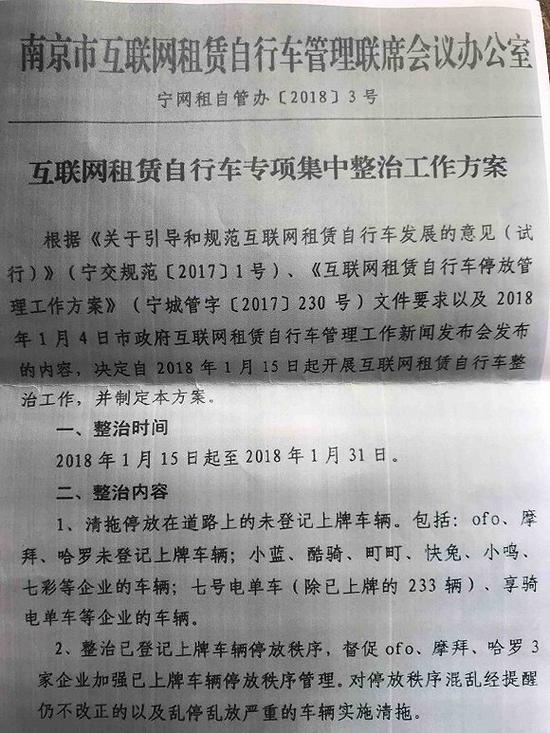 城管人员向界面新闻记者出示了一份《互联网租赁自行车专项集中整治方案》。文件显示,南京市的共享单车本该在1月31日之前就整顿完毕了。城管表示,这份文件很早就分发到了各共享单车企业手中,但一个多月以来,各企业似乎对此无所作为,这才有了3月5日起的大规模整顿。