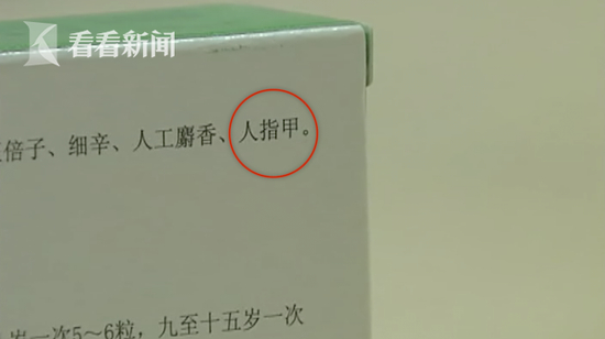 接过药盒,记者还真的在成分表里见到了“手指甲”三个字。那么,这究竟是印刷错误还是这里面真的有手指甲呢?