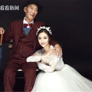 25岁的成都女孩儿小符最近拍摄了一组婚纱照,身穿洁白婚纱的她笑的格外甜蜜。但在她身边的“男伴”不是男朋友,而是她87岁的爷爷。