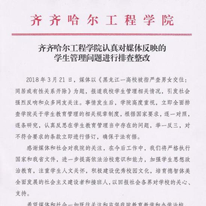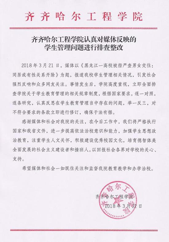 学生同居或有性关系开除?涉事高校回应 澎湃新闻 2018.03.2220:05 关注 原标题:齐齐哈尔工程学院:立即排查规章制度,修订不符合要求条款 齐齐哈尔工程学院认真对媒体反映的学生管理问题进行排查整改 来源:齐齐哈尔工程学院官网