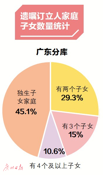 中华遗嘱库广东中心主任庞华幸告诉记者,广东分库的遗嘱订立人中独生子女家庭的比例虽然和全国的统计数据不同,人数略低于多子女家庭,但也高达45.1%,占到近一半;其次是两个子女的家庭占29.3%;3个子女的家庭排在第三位占15%;4个及4个子女以上家庭占10.6%。