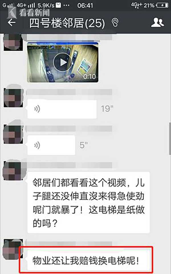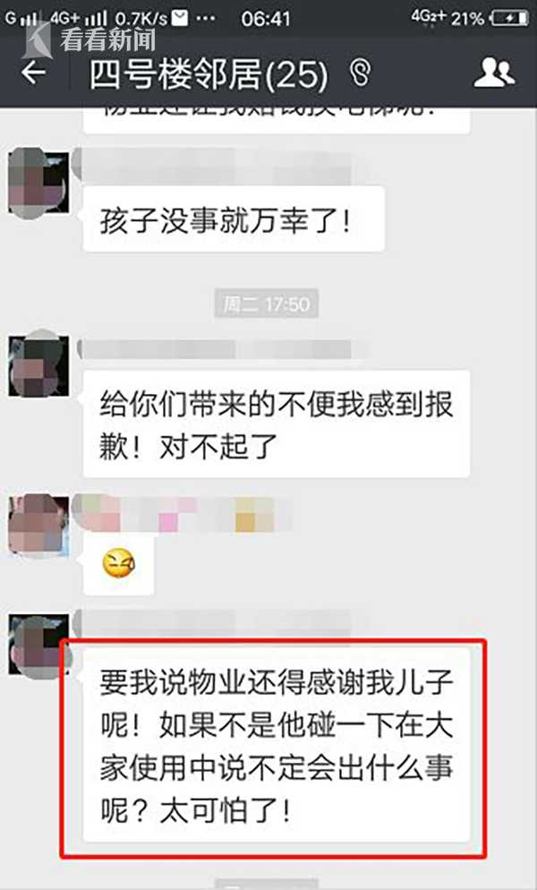 在微信群中,关于物业提出的让她赔钱换电梯的处理方法,孩子妈妈无法接受,她认为:物业应该感谢自己儿子的所作所为。