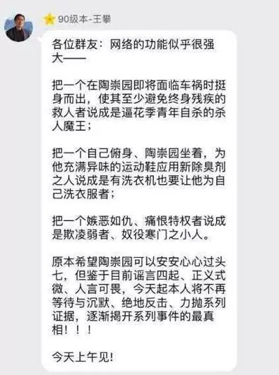 但有陶崇园的同学贴出了王攀在陶崇园出事后发表在相关学生群里的一些言论截图,图中王攀认为陶崇园是死于抑郁症,并表示网上的很多来自家属的说法都是谣言,自己是一个很正派的人。