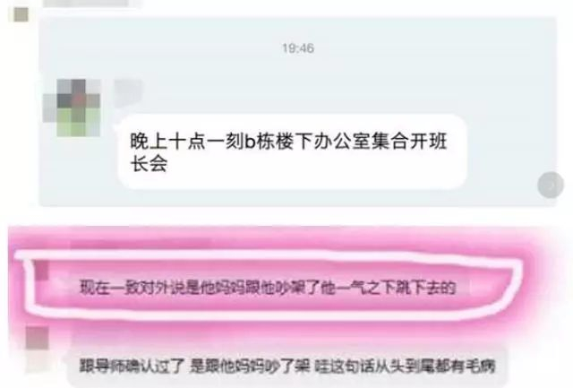 一位陶崇园的同学发给耿直哥的截图则显示,校方曾在陶崇园坠楼后召开了紧急班长会,并在会上表示是陶崇园是在和其母亲 “吵架”后才跳楼的。