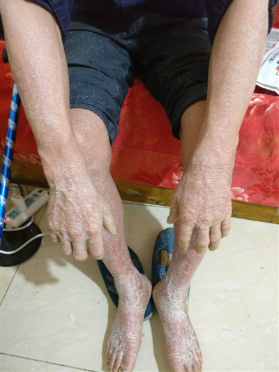 ▲杨先生展示一个月后身上牛皮癣的情况怀着治疗牛皮癣的想法,广安的杨先生来到了成都,不料快到医院时,却被路上收到的传单引去了一个“理疗中心”。一个多月他花了6000余元,不但牛皮癣没有好转,因为脚上出现裂口,他还不得不拄拐。查看了期间买的“药品”,他才注意到,这些多是食品和保健用品。