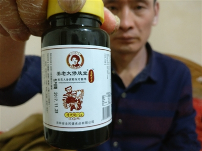 杨先生的女友把这一个多月买的产品摆到桌子上,记者注意到,均为“姜老太”的产品,有止痒膏、爽洗液、抑菌剂等,还有压片糖果。简单查看后记者发现,“姜老太人参螺旋藻复合维生素粉”、“姜老太松茸人参黄精压片糖果”、“姜老太金银花牛蒡根颗粒”的包装上印的是“食品生产许可证”;“姜老太皮康爽洗液”、“姜老太止痒膏”、“姜老太肤舒瘙痒膏”则是“吉卫健用字”,也就是说都属于食品和保健品。而“姜老太祛腐生肌膏”上印的“吉食药监械(准)字”,则属于国产医疗器械类。