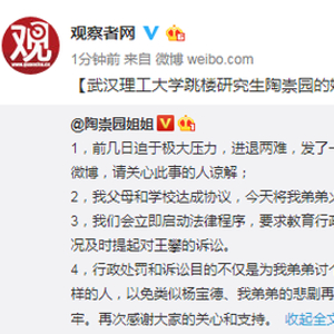 [武汉理工大学跳楼研究生陶崇园的姐姐:此前发致歉微博非本人意愿]
