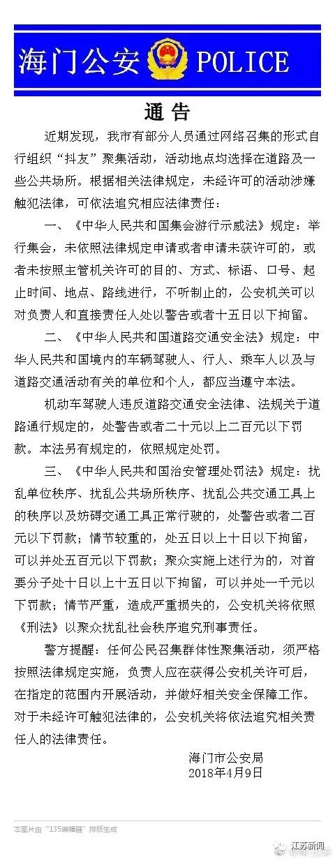 随后,海门公安在官方微博发布通告称,近期发现有部分人员通过网络召集的形式自行组织“抖友”聚集活动,活动地点均选择在道路及一些公共场所。