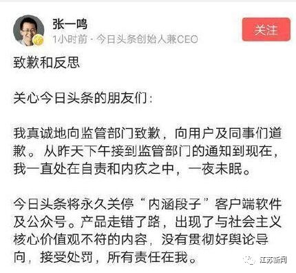 今天凌晨,CEO张一鸣就旗下产品“内涵段子”被永久关停一事公开发布致歉信称,产品走错了路,所有责任在其本人,并表示会将4月作为整改月,成立整改委员会和成立内容监督专家团,对旗下所有产品进行整改。