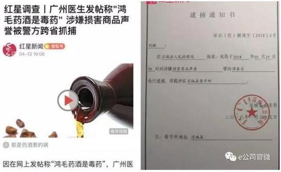 2017年12月19日,广州医生谭秦东发表题为《中国神酒“鸿毛药酒”,来自天堂的毒药》(注:原帖为“鸿毛药酒”)的帖子,称“鸿毛药酒是毒药”。去年12月22日,内蒙古鸿茅国药有限公司一员工受公司委托报案,该员工称:近期多家公众号对“鸿茅药酒”恶意抹黑,造成公司数百万元的经济损失,并严重损害了公司商业信誉。今年1月10日,谭秦东被内蒙古凉城县的数名便衣警察从广州带走,被凉城县公安局刑事拘留。