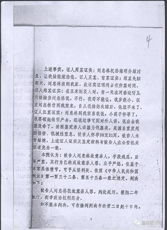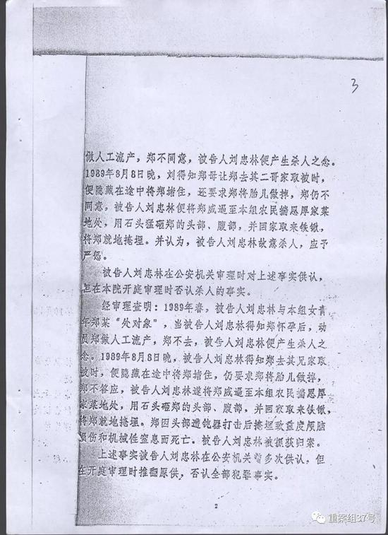 1994年7月,辽源市中级人民法院一审宣判,法院认定,1989年春,刘忠林与郑殿荣“处对象”,当刘忠林得知郑殿荣怀孕后,动员其做流产,由于遭到郑的拒绝,刘忠林于1989年8月8日晚隐藏在郑回家的途中,堵住郑殿荣要求其将孩子做掉,并用石头砸郑殿荣的头部和腹部,取来铁锹将郑殿荣就地掩埋。法院一审以故意杀人罪,判处刘忠林死刑,缓期2年执行。