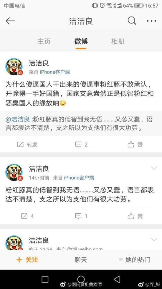 @厦门大学4月21日消息,我校高度重视关于网友反映的网名为“洁洁良”的微博用户在网上发表错误言论一事,马上成立工作组进行调查。经查,该微博用户为我校环境与生态学院在读研究生。目前,学校已启动相关处理程序,将依纪依规对该生进行严肃的党纪校纪处理。