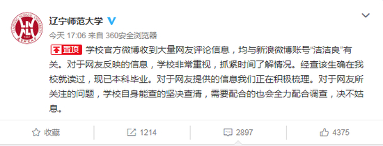 学校官方微博收到大量网友评论信息,均与新浪微博账号“洁洁良”有关。对于网友反映的信息,学校非常重视,抓紧时间了解情况。经查该生确在我校就读过,现已本科毕业。对于网友提供的信息我们正在积极梳理。对于网友所关注的问题,学校自身能查的坚决查清,需要配合的也会全力配合调查,决不姑息。