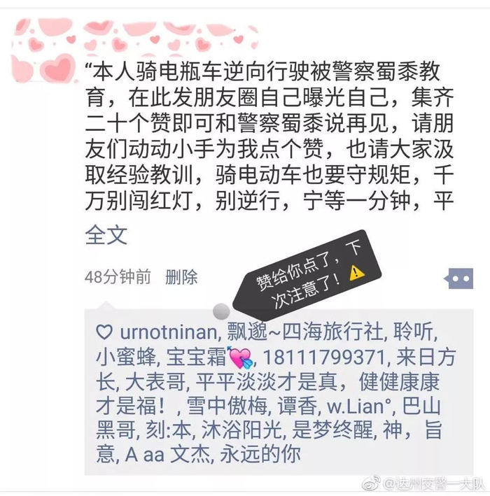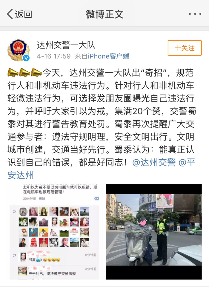 原来,这是达州交警叔叔出的“奇招”,让电动车违法的驾驶人发朋友圈曝光自己的行为,并集满20个赞,意在让大家认识到自己的错误,引以为戒!