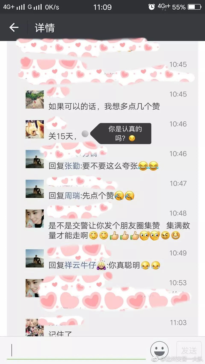 不过交警马上又告诉她,只要她把自己交通违法的事情发到朋友圈,呼吁小伙伴提高交通意识引以为戒,并且集20个赞,可以免除罚款。