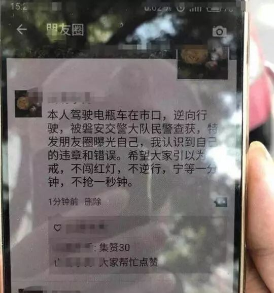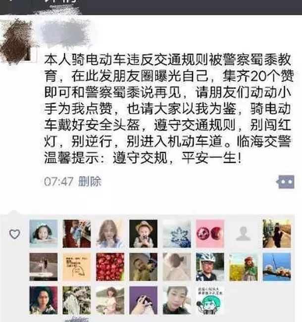 4月16日起,交警在查获电动车违法行为时,不对违法驾驶人采取罚款处罚。而是要求当事人在朋友圈发信息“集赞”:自己曝光自己不遵守交通规则的行为,认识到自己的错误,希望大家引以为戒,并集满20个赞,交警便对其实施警示教育的处罚决定。