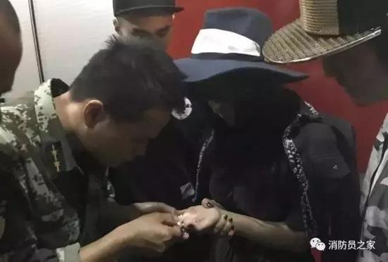 摘戒指这种事,真的是个技术活。戒指小,又和手挨得很近,消防员战士稍一手抖就可能伤到求助的人,真的会紧张出一身冷汗啊。手、脚被卡似乎也成为了一种常见的社会救助,所以这种十分精细的工作,可谓是消防员蜀黍们必备的技能啊。