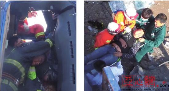 4月20日8时许,一辆满载电石的大货车追尾前方货车后发生侧翻,被困司机双腿卡在扭曲变形的驾驶室内,上半身悬空。救援时,消防人员为了减轻司机的痛苦,用自己的肩膀和后背支撑司机身体近两个小时,直到司机被安全救出。