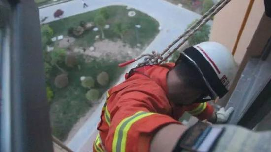 于是,紧急之下,指挥员从高空外降落至8楼进入室内救人,消防战士钟存泰主动请战悬空27米,从窗外进入屋内成功救援。