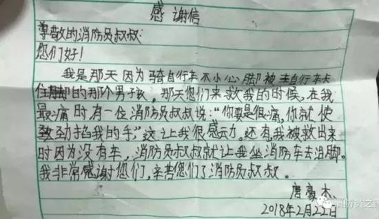 令消防员战士暖心的是,两天以后,小男孩在爸爸的带领下,送去了一封手写的感谢信。
