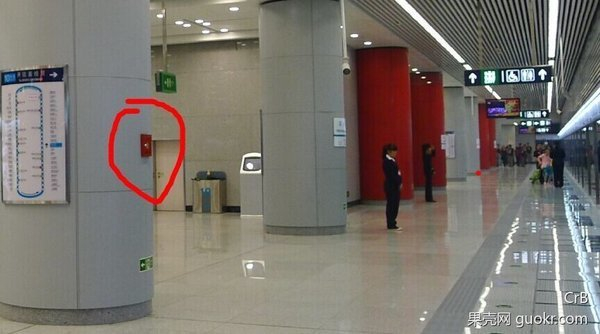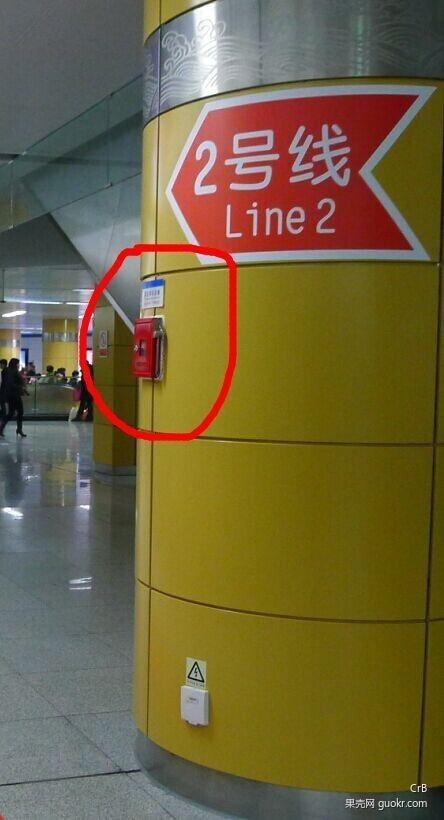 紧急停车按钮一般位于靠近车头和车位的站台两端立柱上——建议平时可以有意识地关注紧急停车按钮在站台的什么地方,注意不要和火灾报警混淆,非紧急情况千万不要没事乱碰!