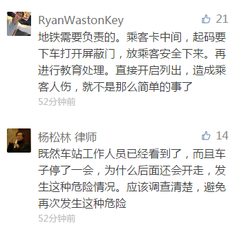 “当时一号线准备关门开走了,但是外门(屏蔽门)关得慢一点。那个阿姨(被卡女子)就说自己要迟到了,然后把外门扒开了,但是车厢门没开,就这样被卡在地铁和外门中间。好像外面的工作人员看到了,中间地铁停了一会儿,但还是开走了。”