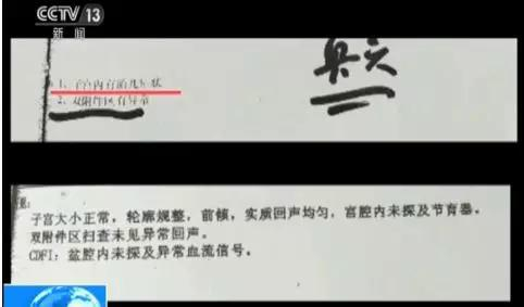 这两份B超单显示为同一时间、同一家医院、同样一名医生,而检查结果却截然相反。