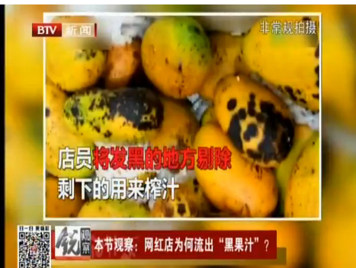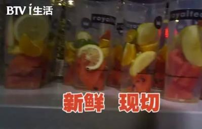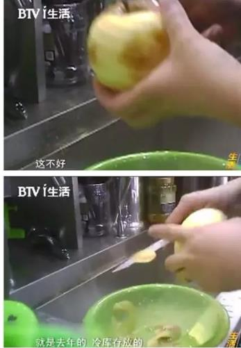 而店内主打新鲜、现切的水果杯,店员所用的苹果伤痕累累,显然不新鲜。一问才知道,这些苹果都是去年冷库里面存放的。