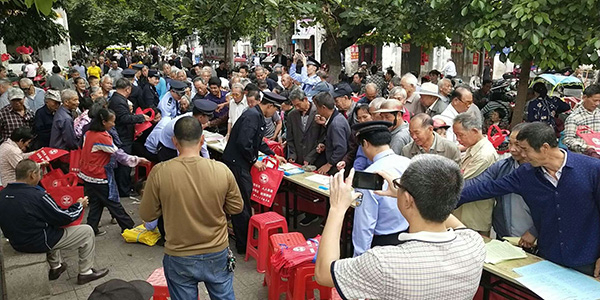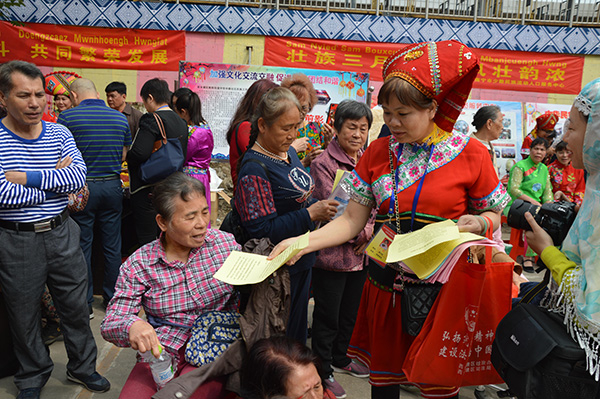 4月18日,融水苗族自治县防范办以防范邪教组织侵蚀为重点,深入白云乡“壮族三月三”双河庙会开展反邪教警示教育宣传活动。抢花炮、拔河比赛、壮歌比赛、跳舞等丰富多彩的民间传统节日活动,使黔桂两省交界的毗邻县乡各族各族人民前来观享这一盛大的壮族风情庙会。