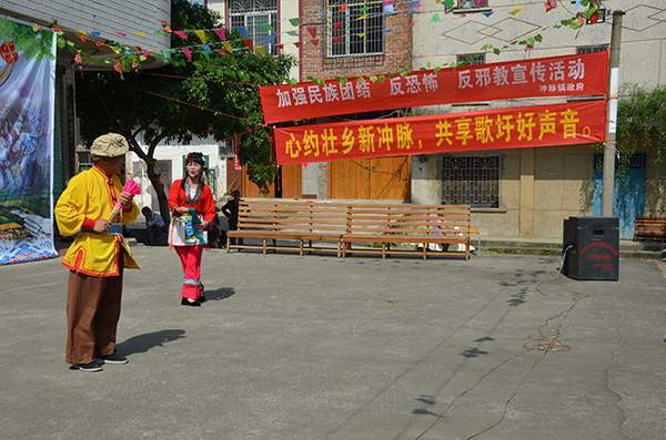 4月17日,冲脉镇举办庆祝壮族“三月三”暨壮欢大赛,综治办借此鼓励参赛者以反邪教为内容进行壮欢对唱,并通过发放反邪教知识手册、挂横幅等形式开展反邪教宣传活动。壮欢对唱,是壮族人最喜爱的一种歌体,传递反邪教知识,将反邪教宣传教育与娱乐融为一体,让群众在娱乐中受到教育,在口口相传中让反邪教意识深入人心。