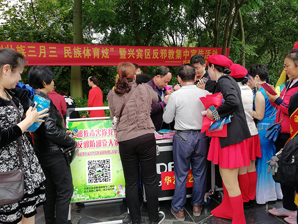 来宾市是2018年广西“壮族三月三·民族体育炫”活动暨体育庙会活动的主会场,兴宾区防范办组织“五老”志愿者在 “三月三”系列活动活动现场悬挂横幅、展示展板和发放反邪宣传资料,向前来观看比赛的群众宣传邪教的主要特征和危害、国家取缔邪教组织的相关法律法规、邪教与宗教的区别等内容,并手把手指导群众通过手机关注微信公众号,并参与“文明家庭拒绝邪教”承诺网上签卡活动,营造了浓厚的反邪、防邪社会氛围,切实增强广大人民群众自觉抵御邪教侵蚀的能力。