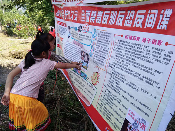 活动中,工作人员利用通俗易懂的各民族语言在现场授课、讲解反邪知识、答疑群众咨询、传授防邪技能,摆放反邪教宣传展版,开展“家庭拒绝邪教”承诺卡签订和“文明家庭拒绝邪教”网络签名活动,正面引导各族群众相信科学,走勤劳致富之路,有效提高识邪、辨邪、拒邪、反邪意识和能力。同时,小学生反邪志愿者主动发放反邪教宣传品和宣传单,妇女反邪志愿者奋勇登台高唱反邪山歌,将整个宣传活动推向新的高潮,博得观众的拍手叫好!