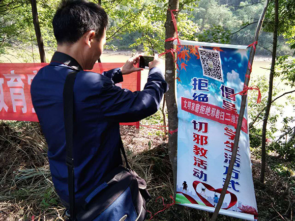 反邪教志愿者引导群众关注微信公众号参与拒绝邪教网络签名
