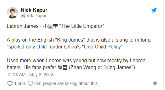 尼克解释道,这个绰号指的是英国一出名为《国王詹姆斯》的戏剧,同时也用于形容中国的独生子女政策下“被宠坏的孩子”。对于该绰号身上附带的贬义色彩,熟悉中国球迷文化的尼克赶紧进一步解释称,该绰号更多用于詹姆斯年轻的时候,而且主要是为“詹黑”们所广泛使用,“詹蜜”们更喜欢用“詹皇”。