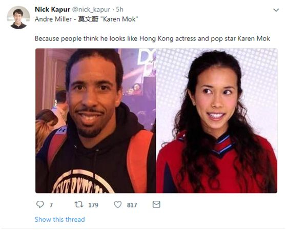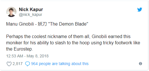 5月7日,《今日美国》体育频道旗下的For The Win专栏发表了一篇名为《中国给NBA球星起的绰号有趣、诡异,还有点刻薄》文章,文章称,一个叫尼克·卡普尔的现代东亚历史学家,在他的个人推特里汇集了一个信息丰富且有趣的主题,涵盖了中国篮球迷为联盟中最受欢迎的球员所提出的绰号。